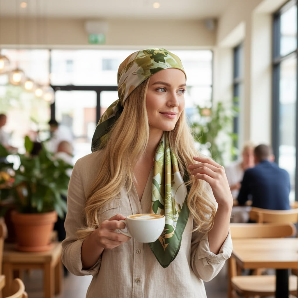 Le Foulard Cheveux Femme CLAIRE est parfait pour styles élégants et décontractés. Fabriqué à partir de tissu lisse de couleur verte et de motifs Nature Zen, il se noue facilement avec une taille de 90 cm. Offert avec livraison gratuite, ce sublime foulard est idéal pour les accessoires de mode et les traitements de chimiothérapie. Faites le choix de CLAIRE pour un look unique et chic.