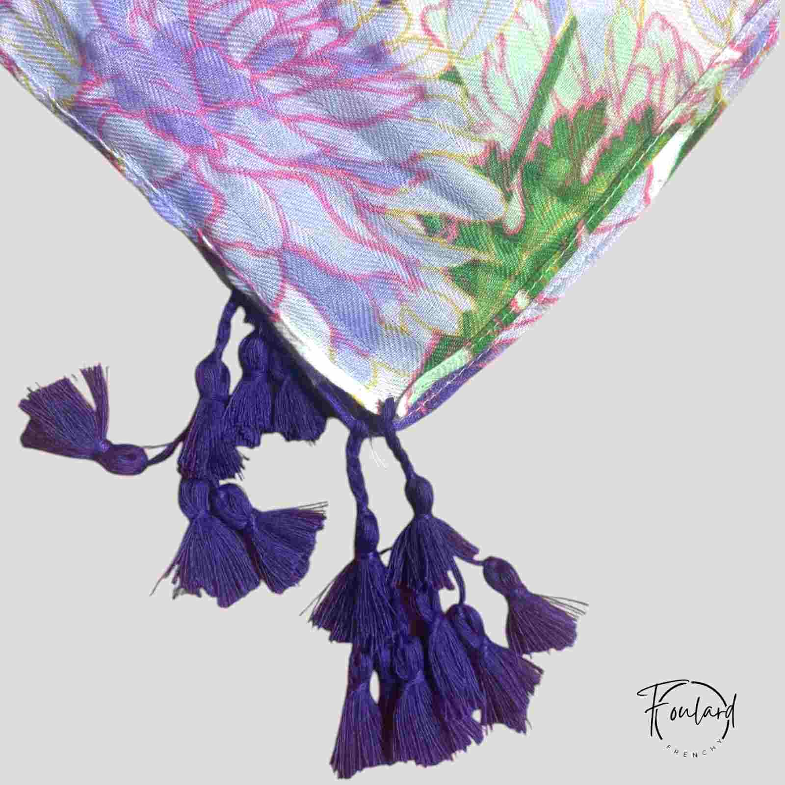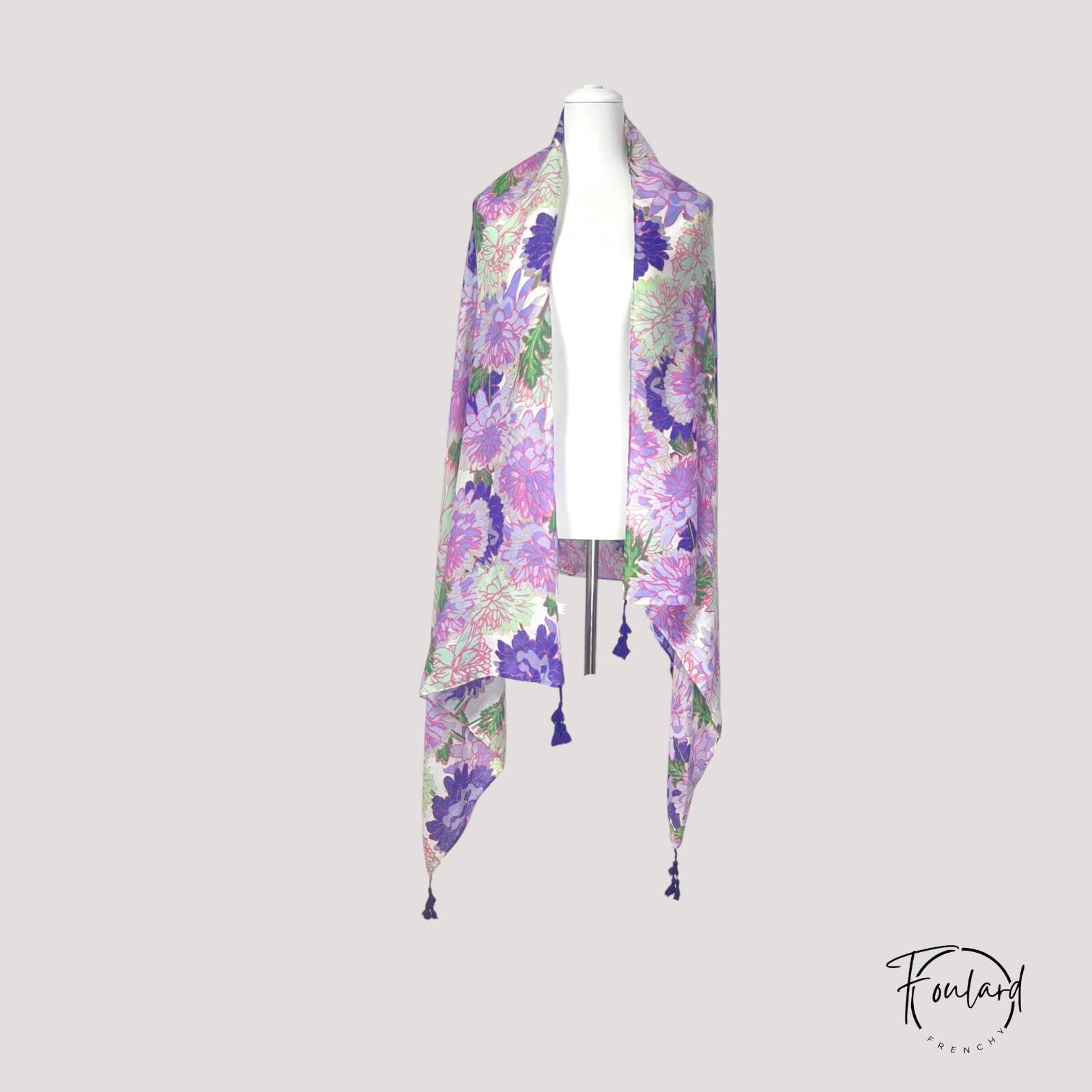 Apportez une note de douceur et de poésie à vos tenues avec ce foulard en coton aux motifs floraux pastel. Ses tons délicats de vert d’eau, lilas, rose et violet dessinent de grandes fleurs élégantes sur un fond clair, pour un style à la fois romantique et raffiné.